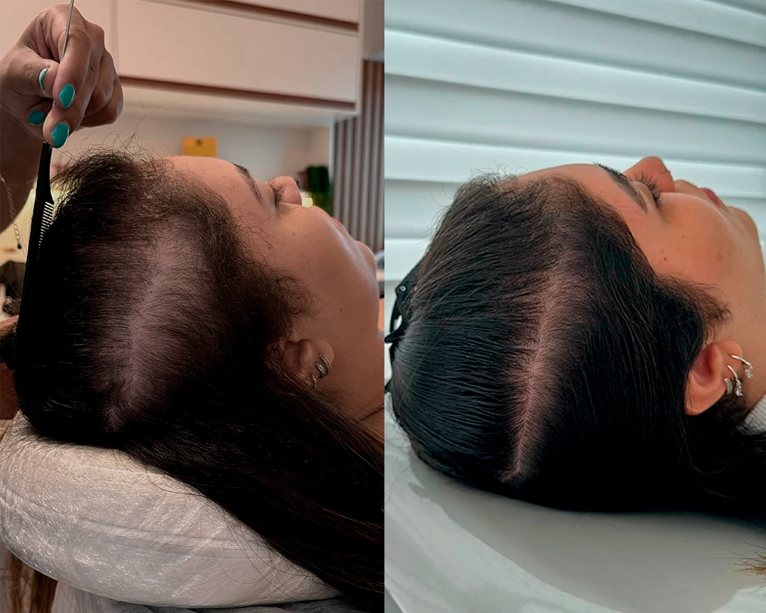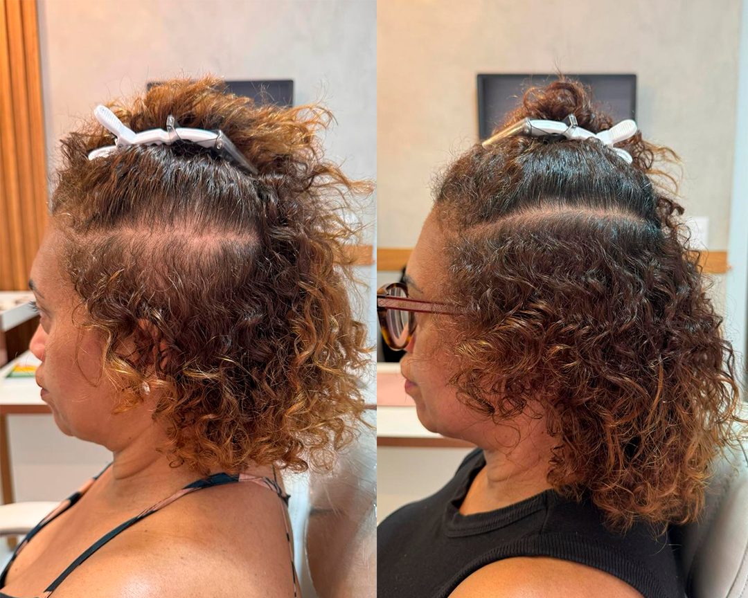 "Antes de qualquer coisa, eu queria muito agradecer de coração por esses últimos meses. Vocês não só devolveram o meu cabelo, mas também a minha autoconfiança para fazer pequenas coisas, como ir a uma piscina e molhar o cabelo sem me preocupar com as falhas aparecendo. Meu cabelo sempre foi fino, mas depois do período em que tive problemas hormonais, ele caiu muito mesmo. Foi quando decidi procurar tratamento."